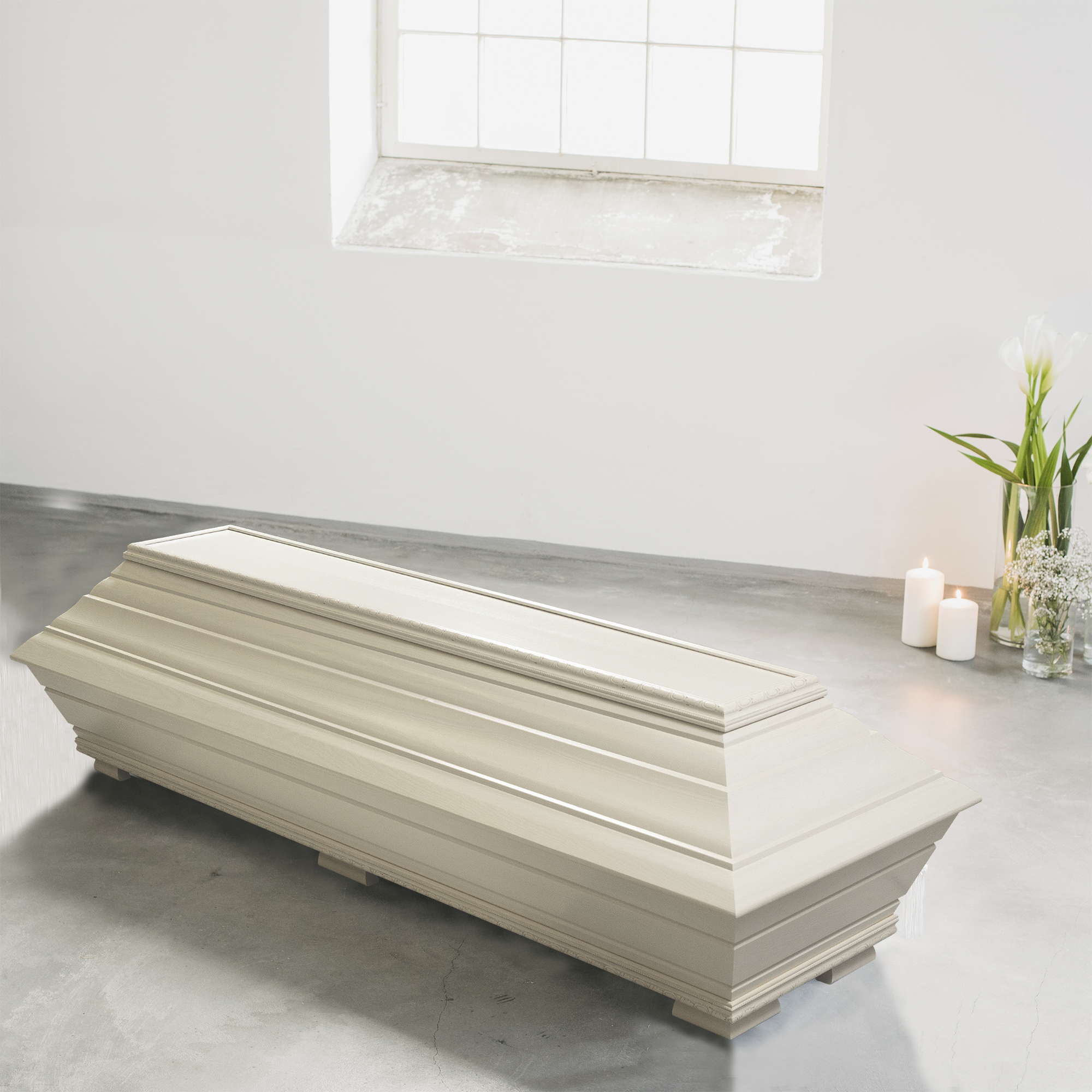 Kuultavan valkoiseksi käsitelty perinteinen arkku on valmistettu kotimaisesta hongasta. Sen tyylikäs muotoilu ja hieno viimeistely kertoo vuosikymmeniä ikäpolvelta toiselle siirtyneestä puusepäntyöstä.