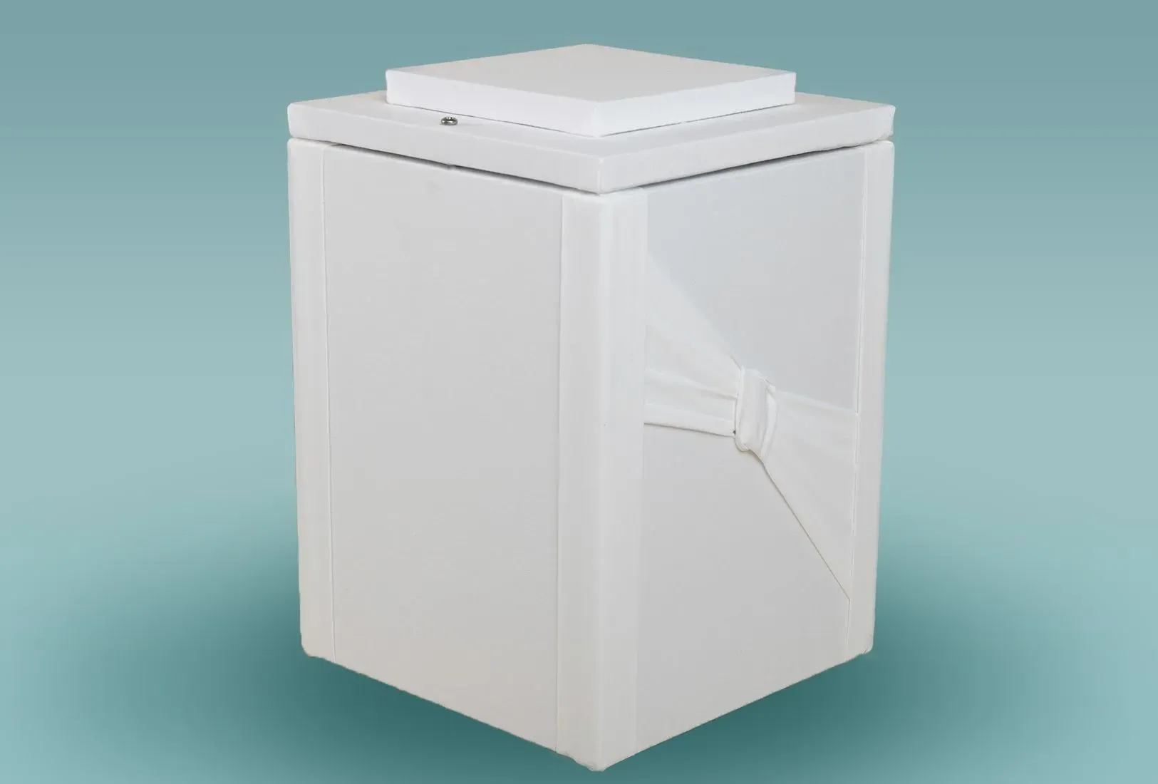 Punkalaitumella käsityönä valmistettu puuvillaverhoiltu uurna. Viimeistelynä kaunis solmulaskos.