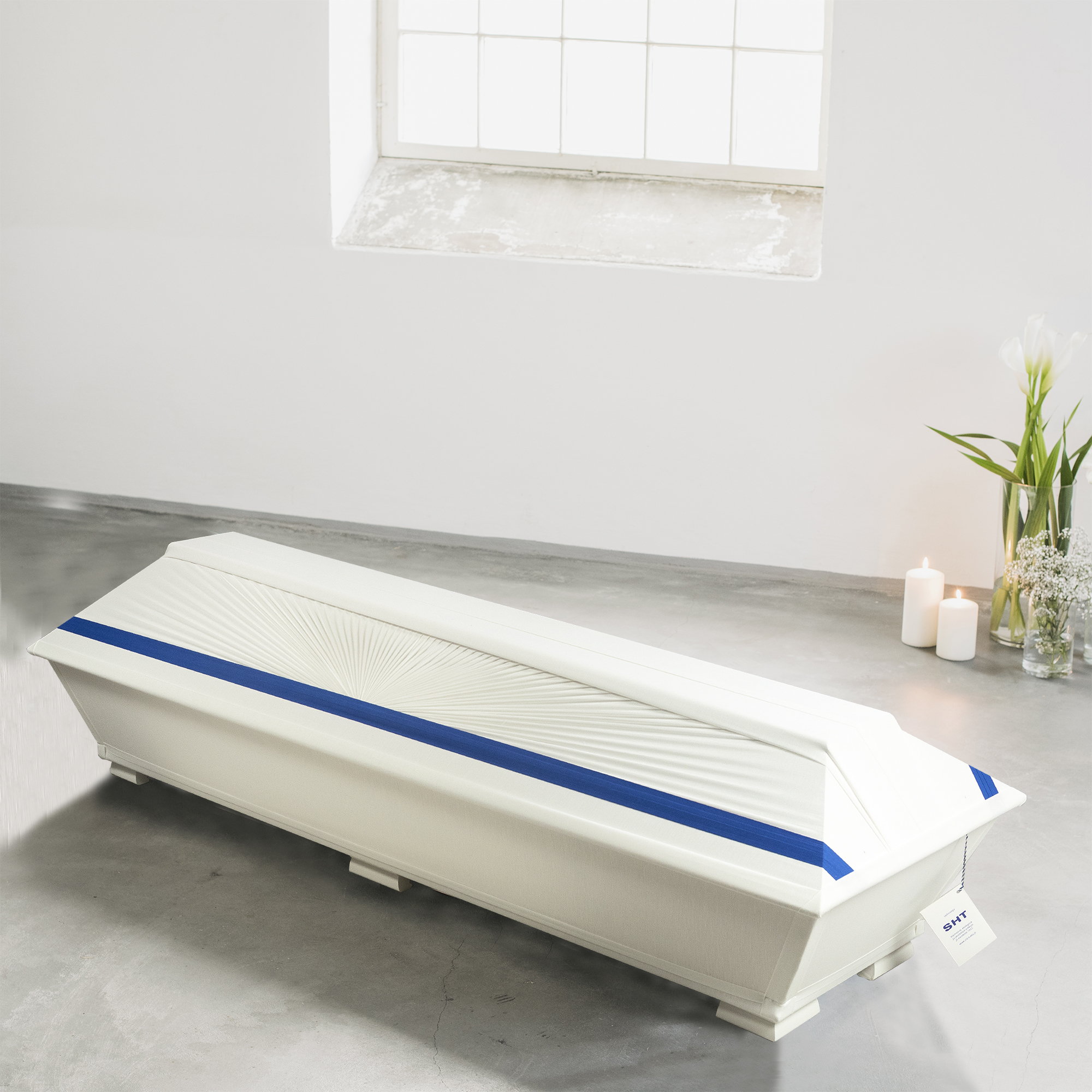 Suomen juhlavuoden arkun seesteinen pellavaverhoilu vie ajatukset kohti elämän iltaa: auringon valkeat säteet vaipuvat siniseen mereen. Huolellinen sädelaskostus ja leveä merensininen nauha viimeistelevät ilmeen.
