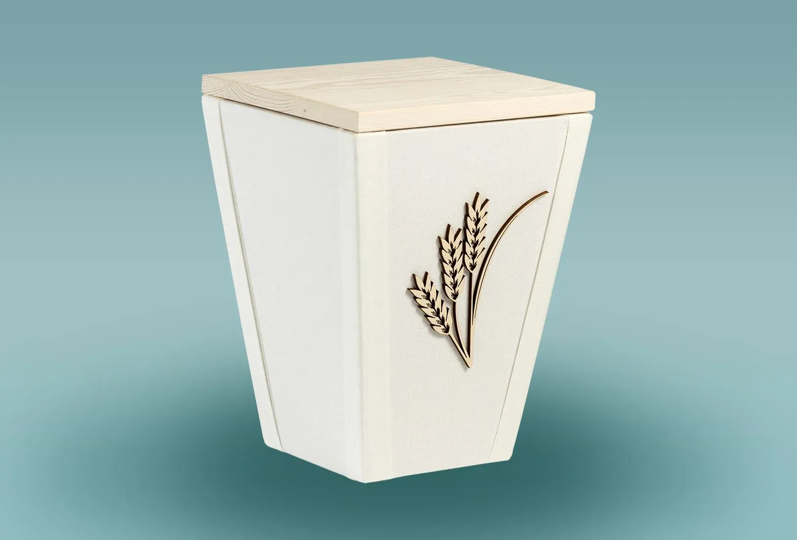 Kypsän viljan huojuminen tuulessa, kauniit elokuun sävyt. Vaalealla pellavalla verhoiltu, alaspäin kapeneva uurna valmistetaan Punkalaitumella.